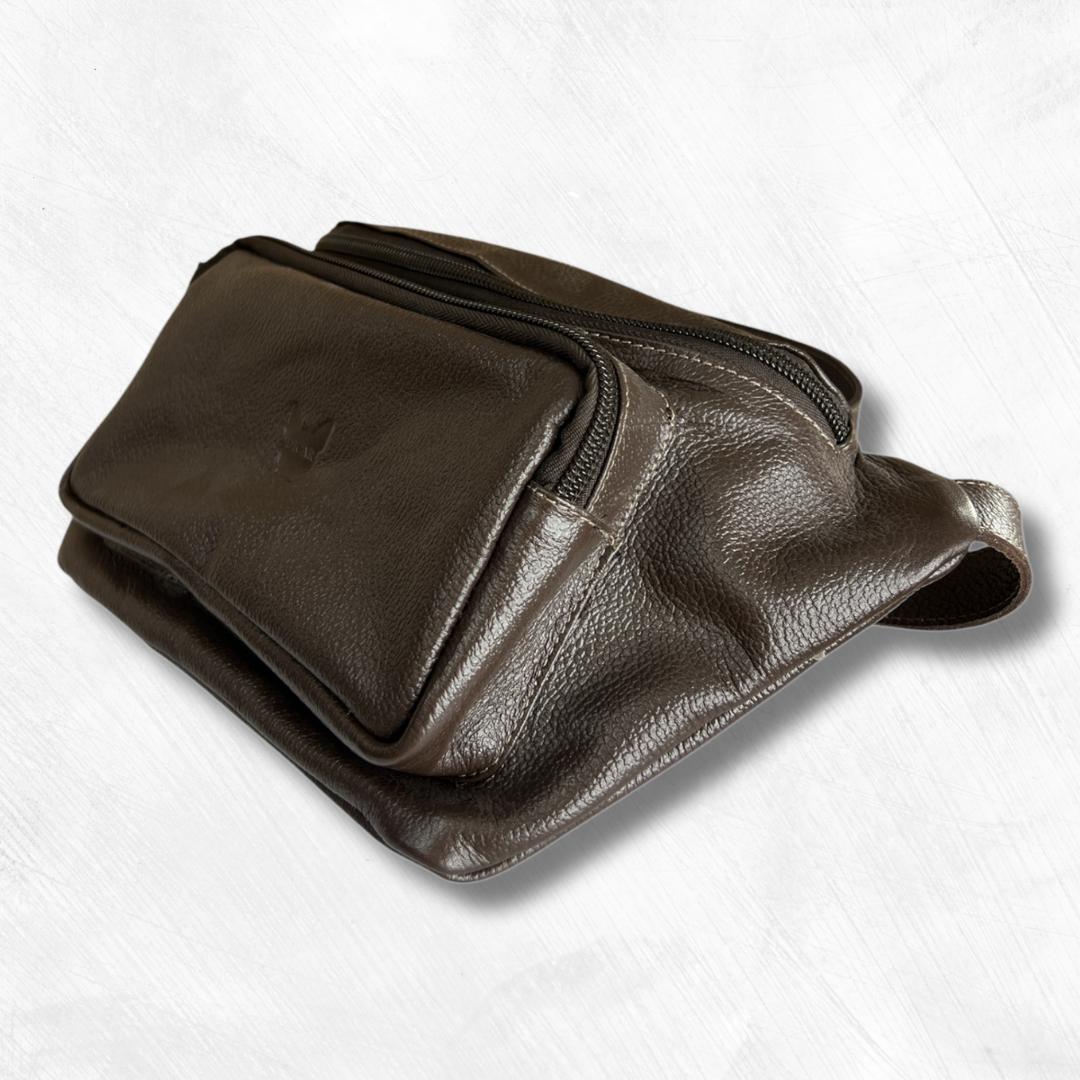 Diseñado para quienes buscan una combinación perfecta de elegancia y funcionalidad, este canguro de cuero es el accesorio ideal para llevar tus pertenencias con estilo y seguridad. Elaborado en cuero genuino de alta calidad en tono café, presenta un diseño moderno y sofisticado. Cuenta con dos compartimientos.